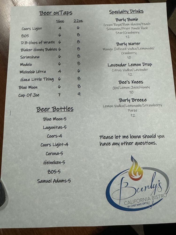 With options for private dining and an inviting outdoor space, it’s a perfect spot for gatherings. Burly’s California Bistro offers great food, attentive service, and a welcoming atmosphere—truly a must-visit!